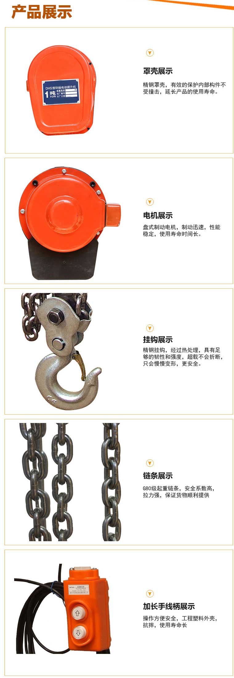 5、极限开关:吊上吊下都有极限快关装置,使电机自动停止,反防止链条超出,确保安全。