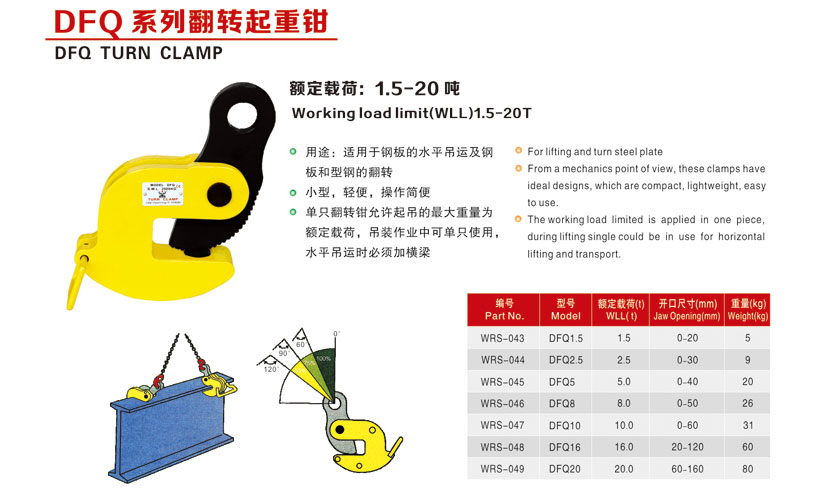 DFQ型翻转吊钳适用于钢板水平吊装、竖直吊装和型钢的翻转,此类起重钳采用首钢低碳优质合金钢制造,强韧耐久,易操作。更适于h钢翻转(由H状—I状,I状—H状),载荷范围:0-5吨。DFQ型翻转钢板吊钳以单只试验为额定载荷,吊装作业时单只使用,水平吊装时,必须加平衡梁,在吊装过程中不得碰撞被吊物,严禁超载使用。本产品严格按国家3包执行,产品质量由中国人民保险公司(PICC)承保,请放心使用。