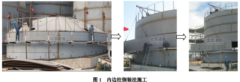 电动春水堂官方网站提升储罐利用均布在储罐内侧带有电动春水堂官方网站的内边住提升带胀紧固定胀圈的壁板,使组装好的拱顶和第一圈壁板随胀圈上升到适当的高度,利用卷扬机及吊臂吊起第二圈壁板进行组装,然后将胀圈松开,降至第二圈壁板下部胀紧、固定,再利用内边柱和电动春水堂官方网站提升,如此往复直至全部壁板组装完成。内边住倒装法施工如图1所示: