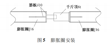 膨胀圈采用16滚弧制成,根据罐体周长分若干节制作,本工程分为4等分,膨胀圈安装时,在膨胀圈4等分位置处用4个16t千斤顶将膨胀圈顶紧,使其紧贴在罐壁上,通过龙门卡具将膨胀圈与罐壁固定成一体,龙门卡具沿着膨胀圈每隔1m设置一个,膨胀圈用千斤顶顶紧的4个位置应避开倒装立柱。膨胀圈制作成型后的曲率应和罐内壁的曲率一致,膨胀圈安装如图5所示。